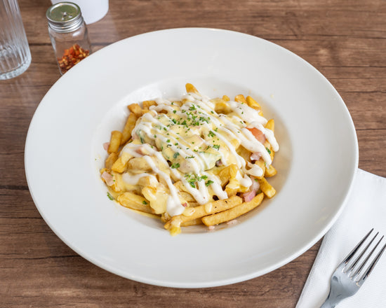 Golden fries topped with tomato salsa, rich cheese sauce, and finished with aioli.